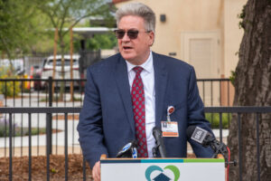 Doug Kleam, St. Bernardine Medical Center Hospital President, addresses the audience at the May 2, 2023, press conference.