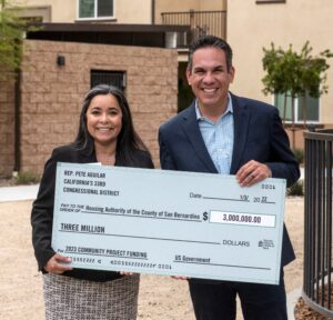 Representative Pete Aguilar (California 33rd District) and HACSB Executive Director Maria Razo display the award of $3 Million in Community Project Funding to support the development of the Arrowhead Grove Community Resource Center.